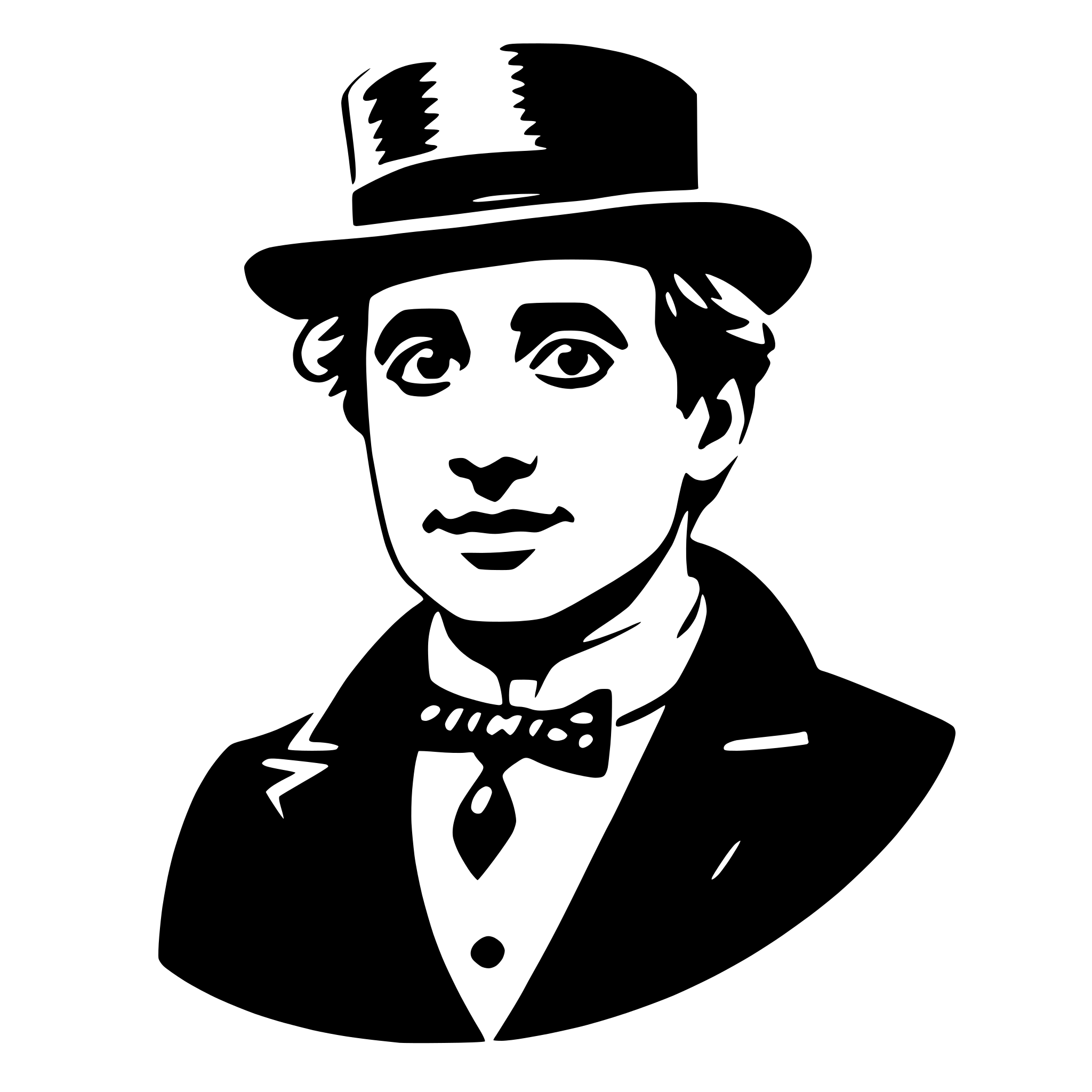 Description: The SVG is a black and white vector illustration of a man. He is depicted wearing a top hat and a suit with a bow tie. The man has a mustache and is smiling. The illustration is stylized with clean lines and lacks detail, giving it a simplistic and iconic appearance. The man's attire and the style of the illustration suggest a classic or vintage theme.
