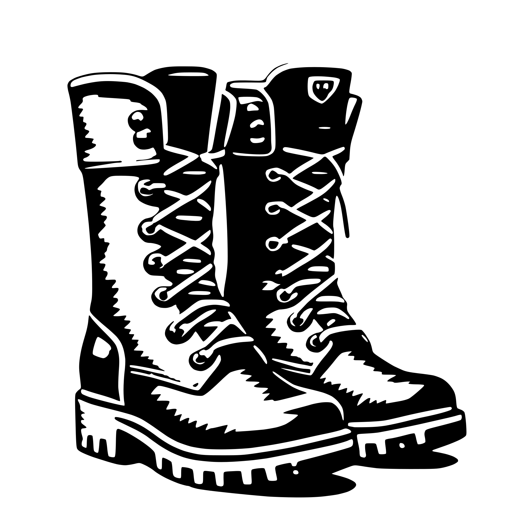 Description: The SVG shows a pair of black boots with white laces and soles. The boots are positioned side by side, with the left boot slightly in front of the right one. The boots appear to be sturdy and possibly designed for outdoor activities or work. The laces are tied neatly, and the soles have a pattern that suggests they might be slip-resistant. The boots are the main objects in the SVG, and there is no interaction between them as they are stationary.
