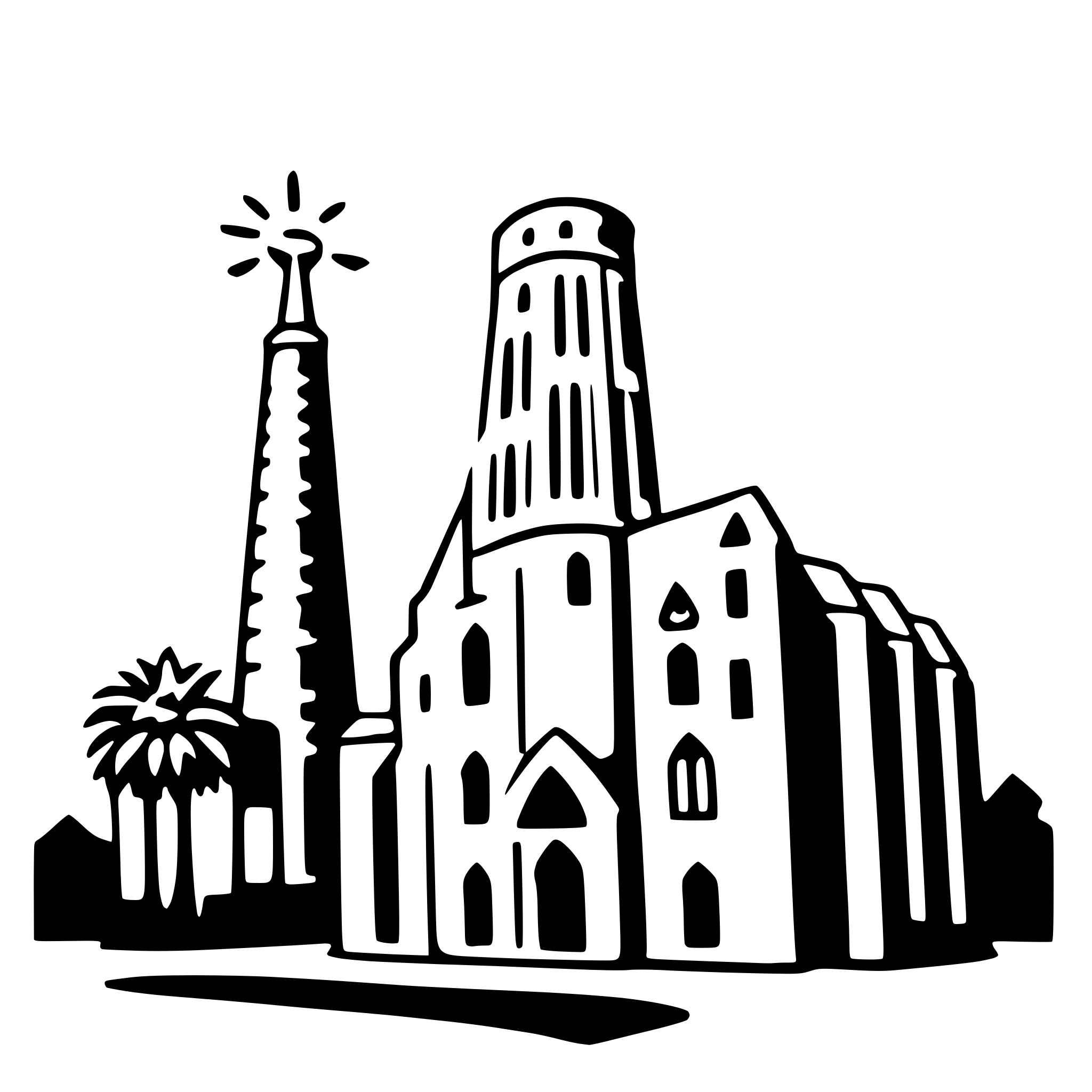 Description: The SVG depicts a stylized, monochrome illustration of a cityscape. The main objects are a tall tower with a pointed top, a large building with multiple arched windows and a central tower, and a palm tree. The tower and the building are positioned in the background, while the palm tree is in the foreground. The illustration is simplistic, with solid lines and minimal shading, giving it a graphic, icon-like appearance. The tower and the building appear to be architectural structures, possibly representing a historical or cultural landmark, while the palm tree suggests a tropical or warm climate. The SVG does not show any interaction between the objects; they are depicted as separate elements within the same scene.