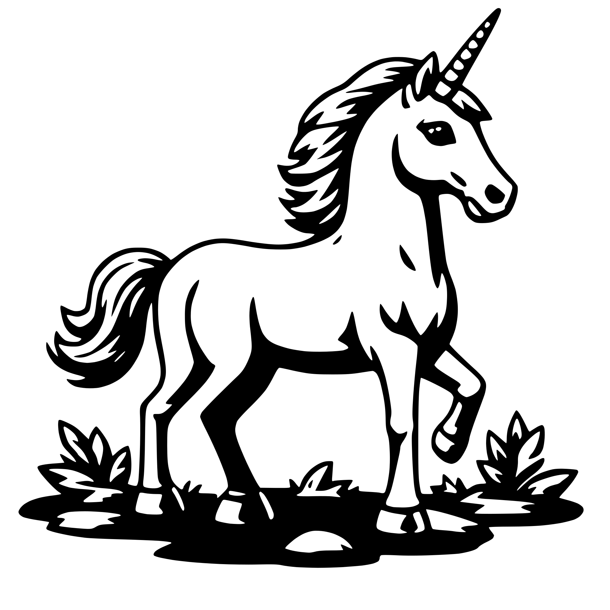 Description: The SVG depicts a stylized, black and white illustration of a unicorn. The unicorn is standing on a grassy area with a few flowers around its hooves. It has a long mane and tail, and its horn is prominently displayed on its head. The unicorn's legs are slightly spread apart, and it appears to be standing still. The overall style is simple and cartoonish, with clean lines and a lack of intricate detail.