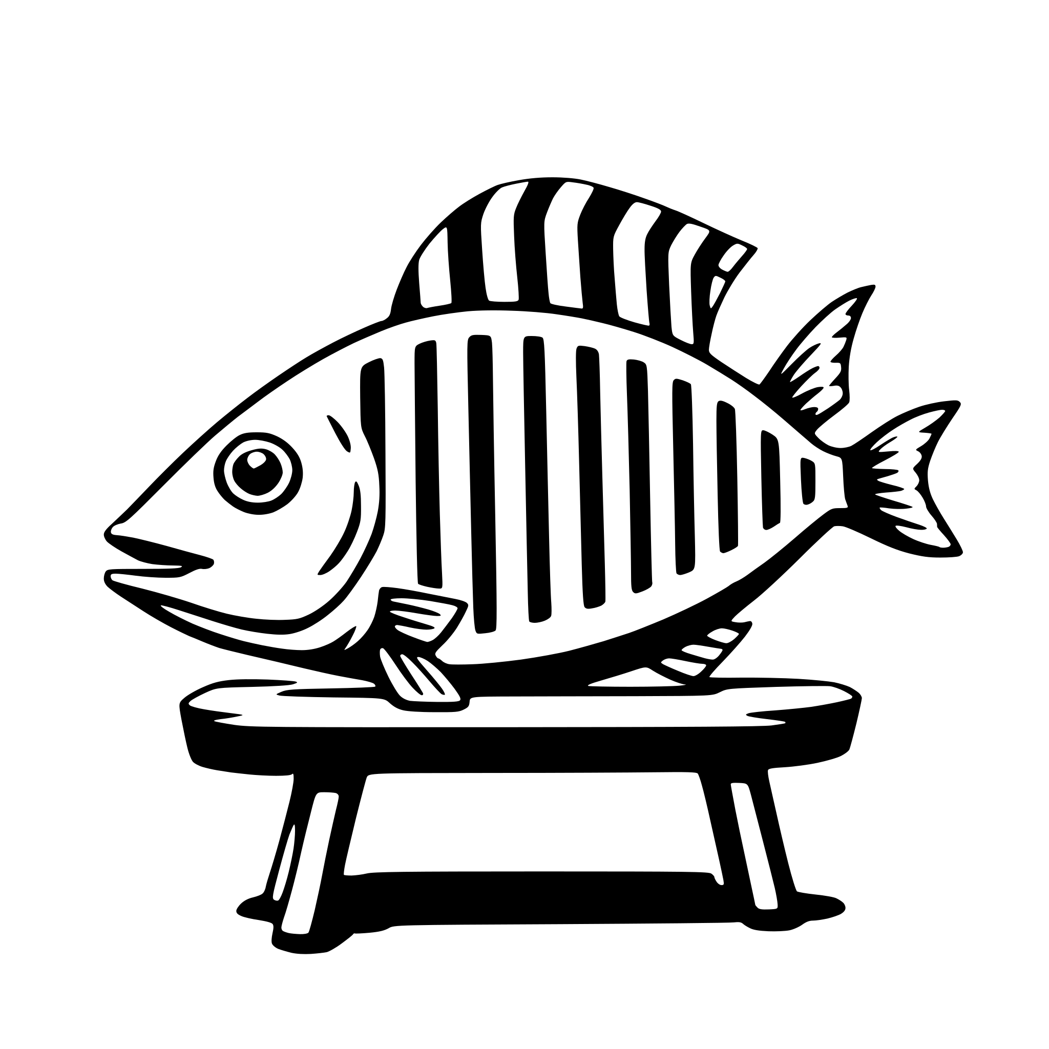 Description: The SVG depicts a stylized fish sitting on a bench. The fish has a prominent eye, a large mouth, and a patterned body with vertical stripes. The bench is simple with a flat seat and a curved backrest. The fish appears to be resting or perched on the bench. The SVG is a vector graphic with a clean, bold line style.